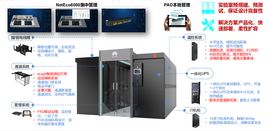 l 一体化集成机柜系统、供配电系统、制冷系统、机房管理系统、防雷接地系统、辅助消防系统综合布线系统,高集成设计,提供完整的解决方案。